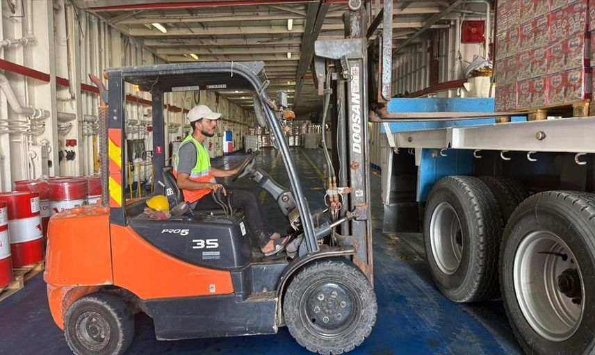 Gazze için insani yardım taşıyan 17. "İyilik Gemisi"nin El-Ariş Limanı'na ulaşmasının ardından başlatılan malzeme indirme çalışmaları devam ediyor. Bebek maması, "aç tüket gıda" ve konserve ürünlerinden oluşan yardımlar, tırlar ve forkliftler yardımıyla karaya taşınıyor.