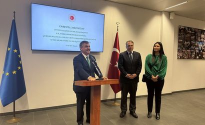 Türkiye'nin Avrupa Birliği (AB) Nezdinde Daimi Temsilcisi Büyükelçi Faruk Kaymakcı, AB Türkiye Delegasyonu Başkanı olarak atanan Büyükelçi Thomas Ossowski'ye Brüksel'de veda resepsiyonu düzenledi. Kaymakcı, etkinlikte konuşma yaptı.