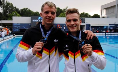 Avrupa Yüzme Birliği (European Aquatics) tarafından Antalya'da düzenlenen Avrupa Su Sporları Atlama Şampiyonası'nda üçüncü gün yarışları sona erdi. Erkekler senkronize 3 metre tramplen finalinde Almanya’dan Moritz Linus Weseman – Timo Barthel ikilisi birinci (ortada), İtalya’dan Giovani Tocci – Lorenzo Marsaglia ikilisi ikinci (solda), Büyük Britanya’dan Leon Baker – Hugo Thomas ikilisi ise üçüncü (sağda) oldu.
