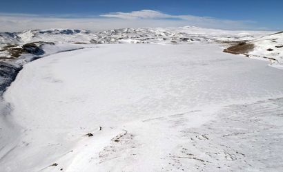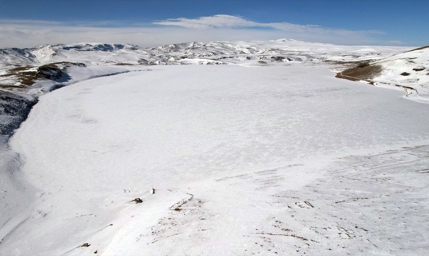 Kars'ın Susuz ilçesinde volkanik kayaçlar üzerinde bulunan 2 bin 300 rakımdaki Aygır Gölü kar ve buzla kaplandı.