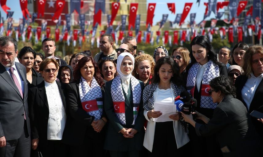 Aile ve Sosyal Hizmetler Bakanı Mahinur Özdemir Göktaş (ortada), Aydın'da "Gazze İçin Sessiz Çığlık" eylemine katıldı. Eylem kapsamında, AK Parti Aydın İl Kadın Kolları Başkanı Şahika Edremit de açıklamalarda bulundu.