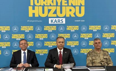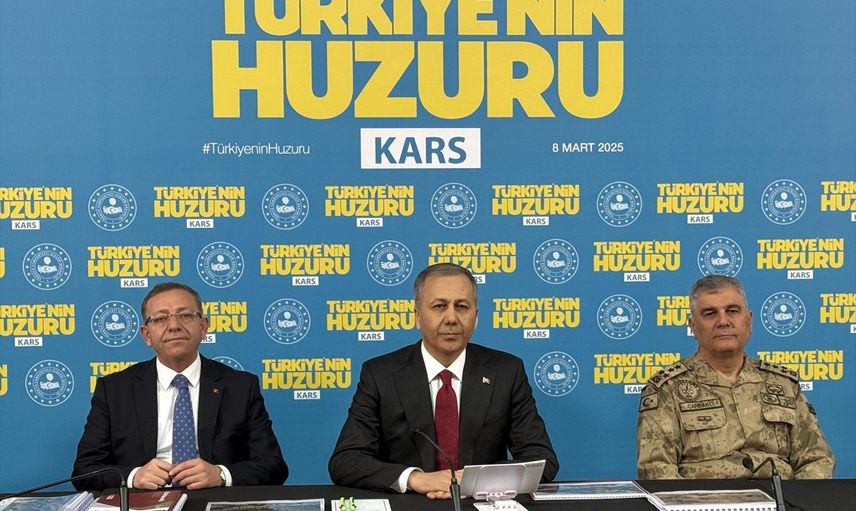 İçişleri Bakanı Ali Yerlikaya (ortada), Kars'ta bir otelde düzenlenen "Türkiye'nin Huzuru Kars Asayiş Toplantısı"nda konuştu.