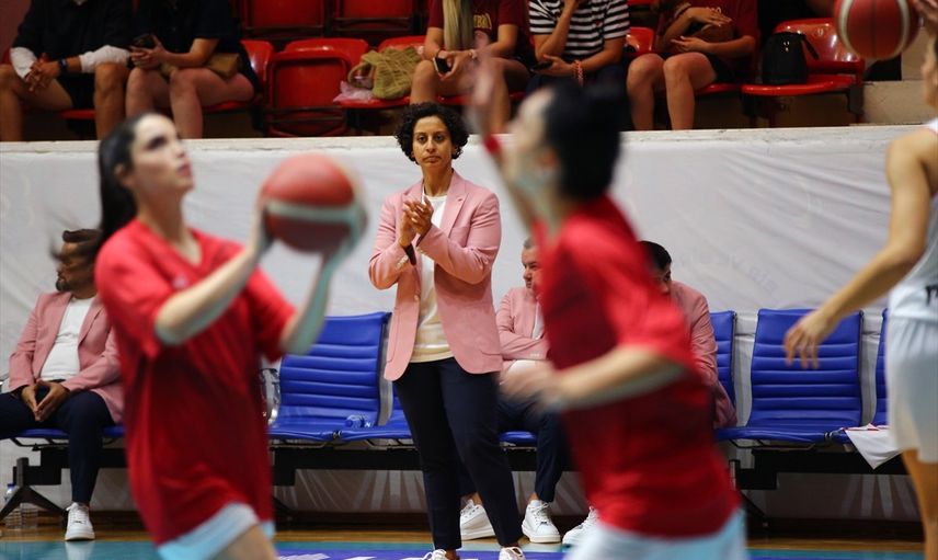 Halkbank Türkiye Kadınlar Basketbol Ligi ekiplerinden Adana Nova Basketbol'un teknik heyeti, meme kanserinde erken teşhisin önemine dikkati çekmek amacıyla iç saha maçlarında pembe ceket giyiyor. Başantrenör Ender Ünlü (ortada) oyuncularına taktik verdi.