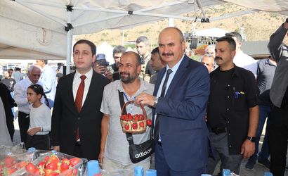 Vali Canalp, festival alanında yöresel lezzetlerin sergilendiği stantları gezdi ve katılımcılara bal, ceviz, çilek ile cevizli sucuk ikram edildi.