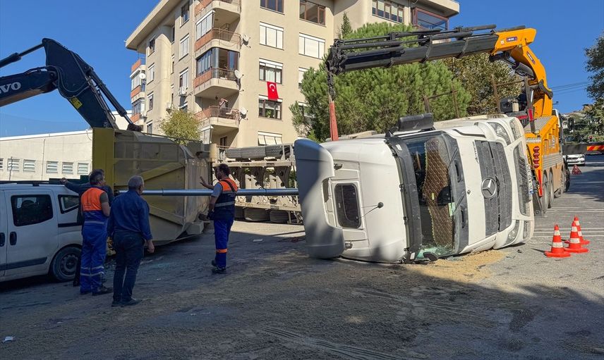 Kamyon, dorsesini kaldırırken yan yattı ve bu sırada sürücüsü yaralandı. Devrilme sonucu kamyon, park halindeki hafif ticari bir araca da zarar verdi.