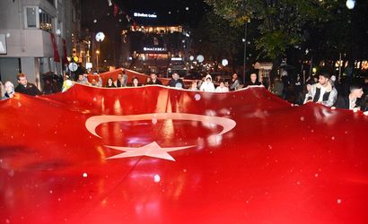Sağanak yağış altında, ellerinde Türk bayrakları ve fenerlerle yürüyen kalabalık, bando eşliğinde marşlar söyledi. Yürüyüş, Cumhuriyet Meydanı'nda son buldu.