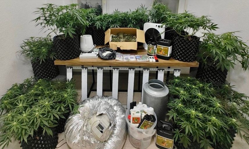 Arama sırasında, 1.050 gram satışa hazır kurutulmuş sentetik uyuşturucu, 1.100 gram likit esrar, 10 gram kokain ve 20 kök kenevir bitkisi bulundu. Ayrıca, 65 parçadan oluşan iklimlendirme ve ışık sistemi ile iki cep telefonu da ele geçirildi.
