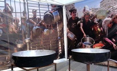 Etkinlik alanında yer alan afişler de dikkat çekti. "Tıbbi malzeme tükendi", "Gazze'de anestezi yok", "Gazze'de oyuncaklar kan içinde" ve "Gazze'de çocuklar sınıfta değil, enkazda" yazılı afişler, durumu çarpıcı bir şekilde özetliyor.