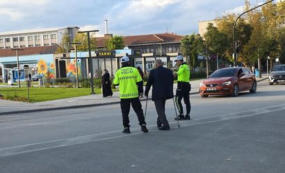 Bursa'nın İnegöl ilçesinde koltuk değnekleriyle yolun karşısına geçmeye çalışan yaşlı kişiye trafik polisleri yardım etti.