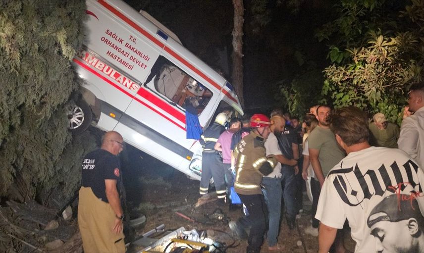 Abdullah P. (60) yönetimindeki hasta nakil ambulansı, yatalak hastayı Orhangazi Devlet Hastanesi'ne götürürken, Sefa Ö. (27) idaresindeki kamyonetle çarpıştı. Çarpışmanın etkisiyle ambulans, yol kenarındaki Orhangazi Belediyesi Fen İşleri Müdürlüğü bahçesinde yer alan ağaç ve duvar arasında asılı kaldı.