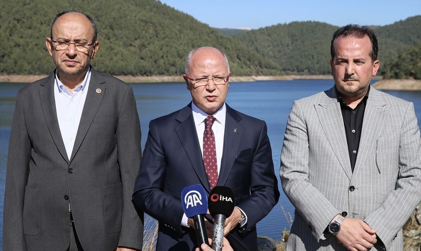 AK Parti Bursa İl Başkanı Davut Gürkan (ortada), Bursa Büyükşehir Belediyesi iştiraki Bursa Su ve Kanalizasyon İdaresince (BUSKİ) başlatılan su kesintilerine ilişkin, Çınarcık Barajı'nda açıklamalarda bulundu.