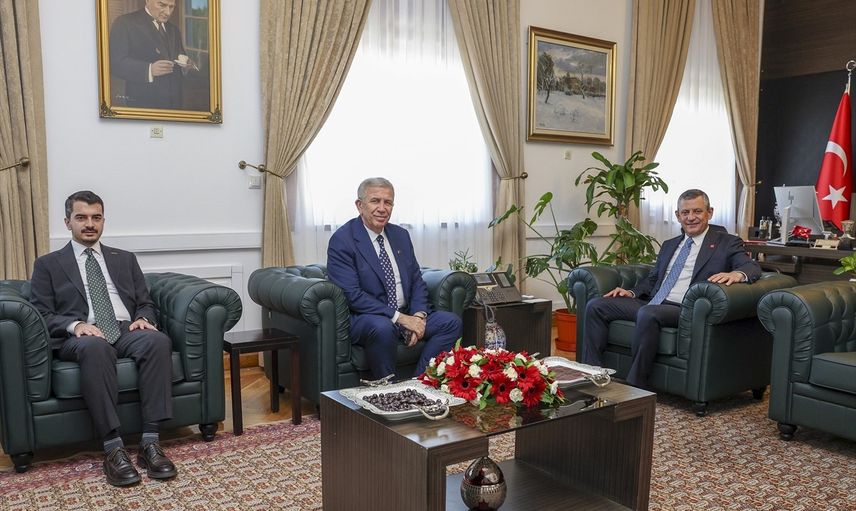 Cumhuriyet Halk Partisi Genel Başkanı Özgür Özel (sağda), Ankara Büyükşehir Belediyesine (ABB) Başkanı Mansur Yavaş (solda) ve Çankaya Belediye Başkanı Hüseyin Can Güner ile Meclis'teki makamında bir araya geldi.