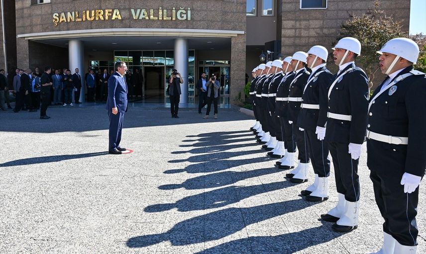 Cumhurbaşkanı Yardımcısı Cevdet Yılmaz, programları kapsamında Şanlıurfa Valiliği'ni ziyaret etti. Yılmaz, valilik önünde tören mangasını selamladı.