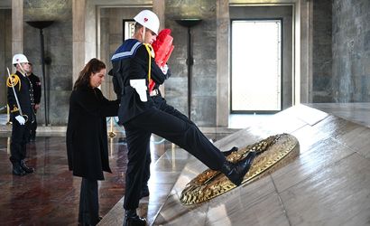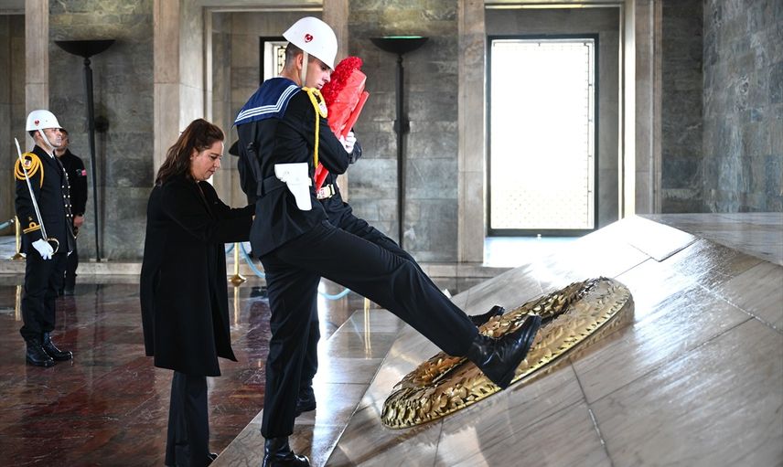 Aslanlı Yol'dan yürüyerek Gazi Mustafa Kemal Atatürk'ün mozolesine ulaşan heyet, Sibel Ayhan Bayer'in çelenk bırakmasının ardından saygı duruşunda bulundu.