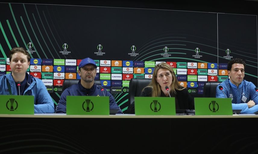 UEFA Konferans Ligi'nin 2. haftasında yarın deplasmanda Samsunspor ile karşılaşacak Ukrayna temsilcisi Dinamo Kiev'in tecrübeli kalecisi Ruslan Neshcheret (sağda) karşılaşmanın yapılacağı Samsun Yeni 19 Mayıs Stadı'nda basın toplantısı düzenledi.
