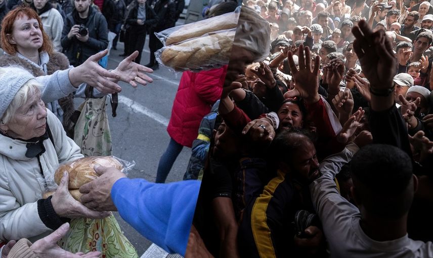 Savaşın etkisiyle Ukrayna ve Gazze'de yaşanan açlık ve su krizi, 16 Ekim Dünya Gıda Günü dolayısıyla Anadolu Ajansının benzer fotoğraflarının yer aldığı özel bir çalışmayla gündeme taşındı. 20 Şubat 2024’te Donetsk bölgesindeki Avdiyivka yakınlarındaki ağır bombardımana maruz kalan Ocheretyne köyünde insani yardım için uzun kuyruklar oluşmuştu (solda). 9 Temmuz 2025’te ise Gazze’nin orta kesimindeki Deyr Belah kentinde, yemek alabilmek için aralarında çocukların da bulunduğu çok sayıda Filistinli izdiham oluşturmuştu (sağda).