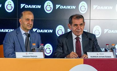 RAMS Park'ta gerçekleştirilen sponsorluk anlaşmasına Galatasaray Kulübü Başkanı Dursun Özbek (sağda), Daikin Türkiye, Orta Doğu ve Afrika Bölgesi Başkanı Hasan Önder (solda), Daikin Türkiye Başkan Yardımcısı Tuna Gülenç ve sarı-kırmızılı kulübün kadın voleybolcuları katıldı.