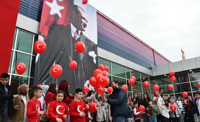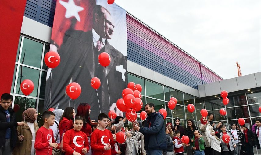 Düzce'de Cumhuriyet'in kuruluşunun 102. yılı dolayısıyla düzenlenen etkinlikte buluşan özel gereksinimli çocuklar, 102 balon uçurdu, Mustafa Kemal filmini seyretti. Gösterimin yapılacağı sinema ay yıldızlı balonlarla süslendi.