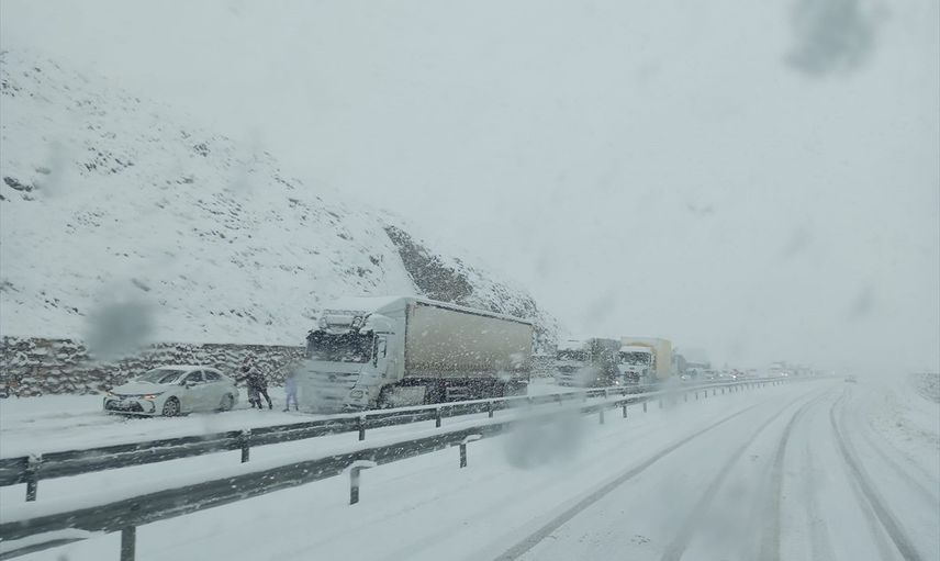 Elazığ-Diyarbakır kara yolunda etkili olan yoğun kar yağışı, ulaşımda önemli aksamalara yol açıyor. Özellikle Gözebaşı Köyü yerleşim alanında yer alan Kinederiç rampasında, kış lastiği takmayan üç tır yolda kayarak trafiği engelledi.