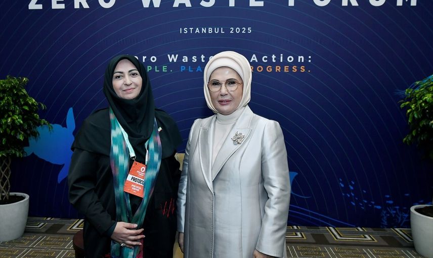 Cumhurbaşkanı Recep Tayyip Erdoğan'ın eşi ve Sıfır Atık Vakfı Onursal Başkanı Emine Erdoğan (sağda), Uluslararası Sıfır Atık Forumu kapsamında İran Cumhurbaşkanı Yardımcısı, Çevreyi Koruma Kurumu Başkanı Shina Ansari (solda) ile bir araya geldi.