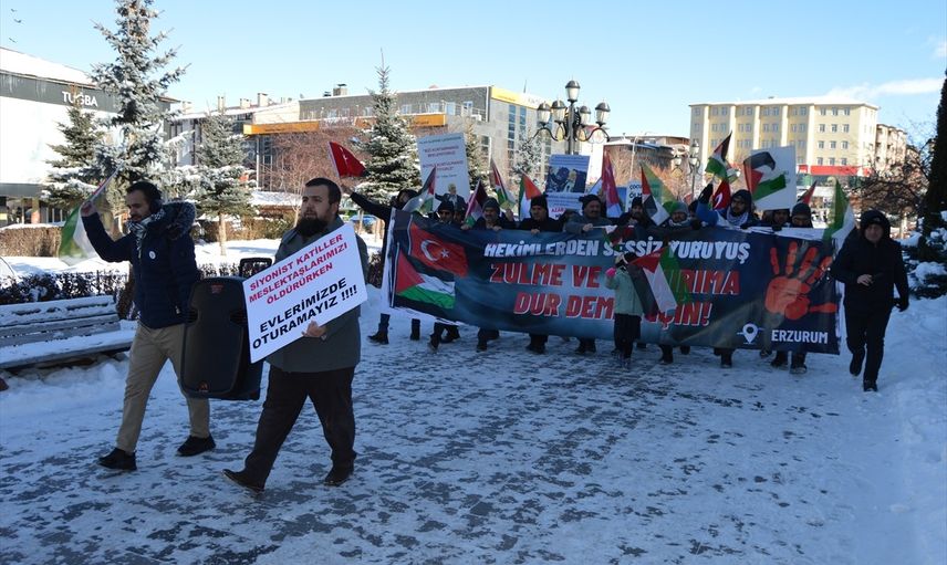 Erzurum'da hekim ve sağlık çalışanları, dondurucu soğuğa rağmen İsrail'in Gazze'ye yönelik saldırılarını protesto etmek amacıyla sessiz yürüyüşlerini 57'nci haftasında sürdürdü.