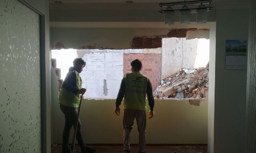 Moloz kaldırma işlemi sırasında oluşan hasarı gidermek için firma görevlileri, dairenin içerisine düşen parçaları temizledikten sonra yıkılan duvarın onarımı için çalışmalarına başladı.
