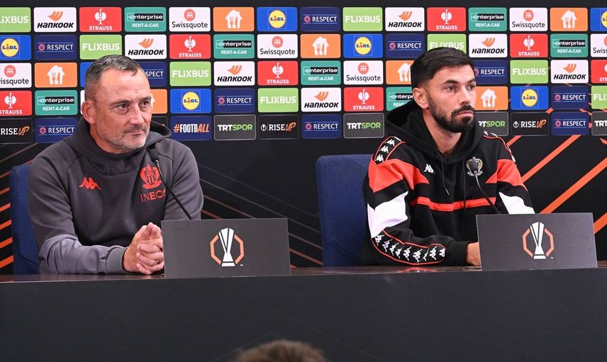 UEFA Avrupa Ligi'nin 2. haftasında yarın İstanbul'da Fenerbahçe ile karşılaşacak olan Nice takımının teknik direktörü Franck Haise (solda) ve oyuncusu Morgan Sanson (sağda), Chobani Stadı'nda düzenlenen basın toplantısında açıklamalarda bulundu.