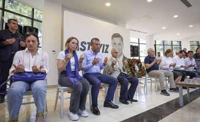 Cumhuriyet Halk Partisi Genel Başkanı Özgür Özel (ortada), hayatını kaybeden Manisa Büyükşehir Belediye Başkanı Ferdi Zeyrek için Manisa Fatih Sergi Salonu'nda, Nurcan Zeyrek (solda) ile birlikte taziyeleri kabul etti.