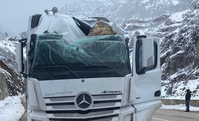 Gümüşhane'nin Torul ilçesinde üzerine kaya parçası düşen seyir halindeki tırın sürücüsü yaralandı. Yaralanan sürücü, ekiplerin müdahalesinin ardından Torul Devlet Hastanesi'ne kaldırıldı.