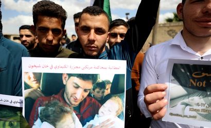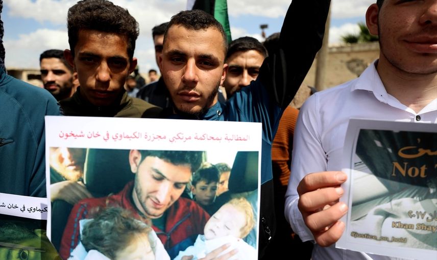 Suriye'nin İdlib iline bağlı Han Şeyhun ilçesinde, 4 Nisan 2017'de devrik Beşşar Esed rejimi tarafından düzenlenen kimyasal silah saldırısının 8. yıl dönümünde, yerel halk ve aktivistler tarafından bir protesto gösterisi gerçekleştirildi. Protesto, saldırıda yaşamını yitiren 100'den fazla sivilin anılması ve kurbanlar için adalet talep ediyor.