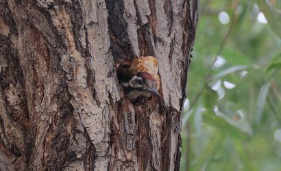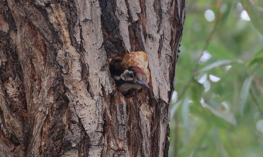 Iğdır İl Özel İdaresi bahçesindeki bir ağacın kovuğuna yuva yapan alaca ağaçkakan yavrusu, kurum çalışanlarının ilgi odağı haline geldi.