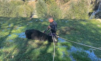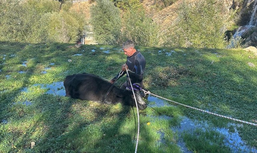 Isparta'da, şelale yakınlarında bataklığa saplanan büyükbaş hayvan, itfaiye ekipleri ile veteriner hekimin ortak çalışması sonucu kurtarıldı.