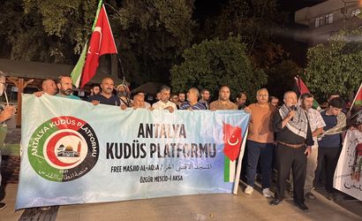 Antalya'da İsrail'in Küresel Sumud Filosu'na yönelik saldırısı protesto edildi. Türk ve Filistin bayrakları taşıyan Kudüs Platformu üyeleri, "Filistin özgür olana kadar mücadele devam edecek" yazılı pankartlarla Muratpaşa Camisi'nin avlusunda bir araya geldi.