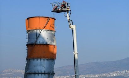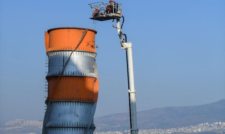 İzmir'in Bornova ilçesinde, bir çimento fabrikasında meydana gelen olayda, temizlik için 70 metrelik bacaya çıkan iki işçi, iskelenin çökmesi sonucu düşerek mahsur kaldı.