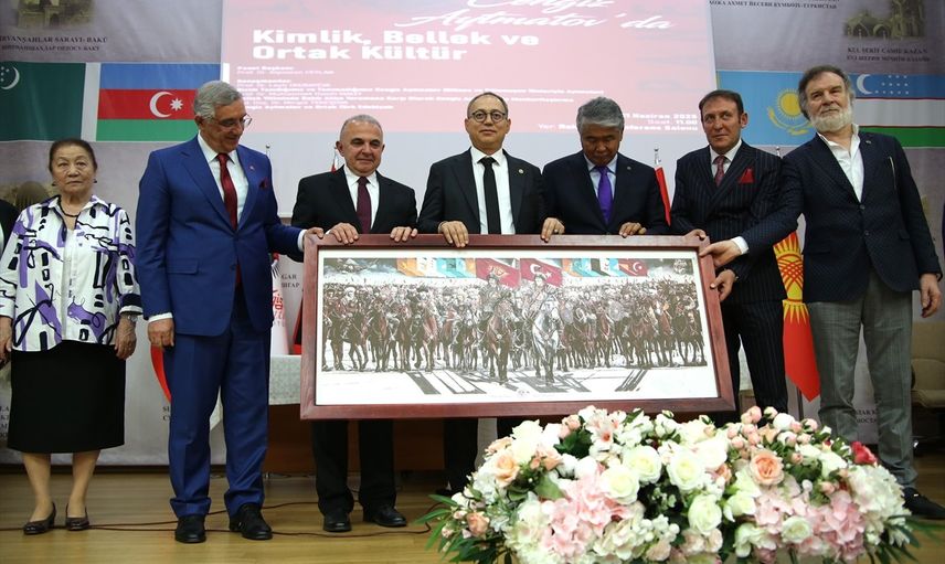 Dünyaca ünlü Kırgız yazar Cengiz Aytmatov'un ölümünün 17. yılına ithafen düzenlenen etkinlikler kapsamında Kırgızistan-Türkiye Manas Üniversitesi'nde (KTMÜ) "Cengiz Aytmatov'da kimlik, bellek ve ortak kültür" başlıklı panel düzenlendi. KTMÜ Cengiz Aytmatov Kampüsü'ndeki Rektörlük binasındaki konferans salonunda düzenlenen panele, Kırgızistan'da bulunan Cengiz Aytmatov Enstitüsü Başkanı ve MHP Genel Başkan Yardımcısı Prof. Dr. İlyas Topsakal (sağ 5), Türkiye'nin Bişkek Büyükelçisi Mekin Mustafa Kemal Ökem (sağ 4), Uluslararası Türk Kültürü Teşkilatı (TÜRKSOY) Genel Sekreteri Sultan Raev, Genel Sekreter Yardımcısı Sayit Yusuf, Azerbaycan'dan ressam Sakit Memmedov, Kırgızistan'daki Cengiz Aytmatov Vakfı Başkanı Eldar Aytmatov, akademisyenler, öğrenciler katıldı.
