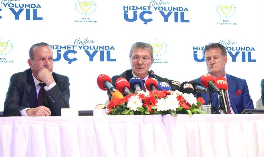 Kuzey Kıbrıs Türk Cumhuriyeti (KKTC) Başbakanı Ünal Üstel (fotoğrafta), Demokrat Parti Genel Başkanı Fikri Ataoğlu ve Yeniden Doğuş Partisi Genel Başkanı Erhan Arıklı ile düzenlediği basın toplantısında iktidarda geçirdikleri üç yılın değerlendirmesini yaptı.
