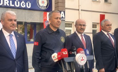 İçişleri Bakanı Ali Yerlikaya (sol 3), Konya Emniyet Müdürlüğü'nde düzenlediği basın toplantısında, bu sabah kentte en kapsamlı uyuşturucu operasyonlarından "Narkokapan Konya"nın başarıyla icra edildiğini söyledi. Yerlikaya'ya açıklamasında Emniyet Genel Müdürü Mahmut Demirtaş (sağ 3), Konya Valisi İbrahim Akın da (sol 2) ve Konya İl Emniyet Müdürü Maksut Yüksek (solda) eşlik etti.