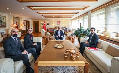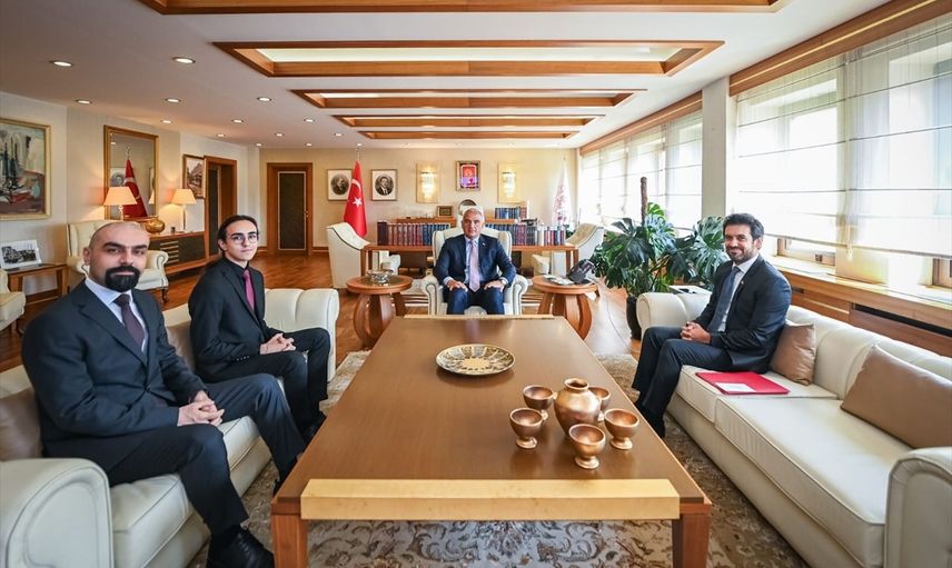 Kültür ve Turizm Bakanı Mehmet Nuri Ersoy (sağ 2), Vigo Uluslararası Piyano Yarışması'nda Martha Argerich Özel Ödülü kazanan piyanist Eren Düzenli'yi (sol 2) kabul etti.
