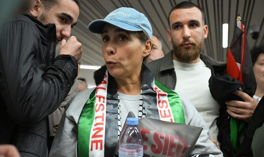 Atina'dan gelen uçakla havalimanına ulaşan aktivistler, kısa bir kucaklaşmanın ardından hoparlörleri alarak coşkulu bir şekilde "Hepimiz Gazze'nin çocuklarıyız", "İsrail'i boykot edin", "Soykırımı durdurun" ve "Özgür Filistin" sloganları attı.