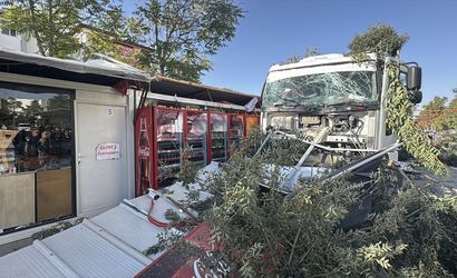 Malatya'nın Yeşilyurt ilçesinde freni arızalanan kamyon, yol kenarındaki 7 konteyner iş yerine çarptı.