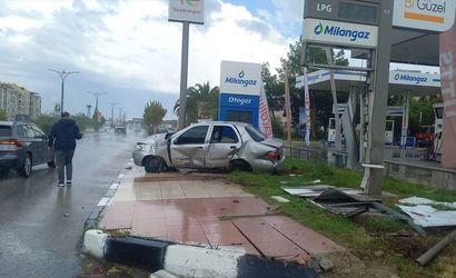 Manisa'nın Şehzadeler ilçesinde bir otomobil, akaryakıt istasyonunun tabelasına çarparak devrildi. Olayda, araçta bulunan iki kişi yaralandı.