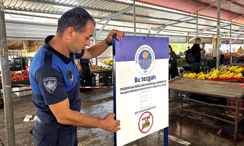 Mersin'in Yenişehir ilçesinde müşterisine kötü davrandığı belirlenen pazar esnafına 15 gün süreyle tezgah kapatma cezası uygulandı. Zabıta ekipleri, esnafın farklı semtlerde tezgah kurduğu pazarlara "Bu tezgah müşteriye kötü davranılması sebebiyle Yenişehir Belediyesinin encümen kararı gereği 15 gün süreyle kapatılmıştır" ifadelerinin yazılı olduğu tabela bırakıyor.