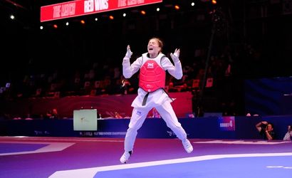 Milli sporcu Merve Dinçel Kavurat (solda), Çin'de düzenlenen Dünya Tekvando Şampiyonası'nda altın madalya kazandı.