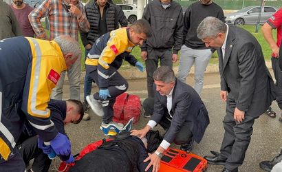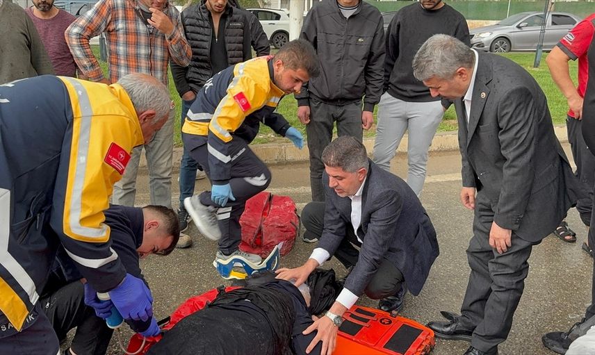 Adıyaman'da otomobilin çarptığı yaşlı kadın, o sırada bölgede bulunan TBMM Bebek Ölümlerini ve Özel Sağlık Kuruluşlarını Araştırma Komisyonu Başkanı ve AK Parti Adıyaman Milletvekili Doç. Dr. İshak Şan'ın (sağ 2) ilk müdahalesinin ardından hastaneye kaldırıldı.