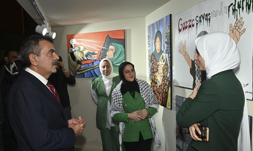 Milli Eğitim Bakanı Yusuf Tekin, Türkiye'ye gelen Filistinli öğrencilerin yaptığı eserlerden oluşan "Umut Acıya Direnirken" adlı resim sergisini ziyaret etti.