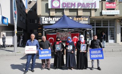Muş'ta çocukları terör örgütü PKK tarafından kaçırılan aileler, DEM Parti İl Başkanlığı binası önündeki eylemlerine devam etti. Çocuklarının dönmesini umutla bekleyen anne ve babalar, "Anneler direniyor", "Evlat nöbetindeyiz" ve "Artık yeter yakamızdan düşün" yazılı pankartlar açtı.