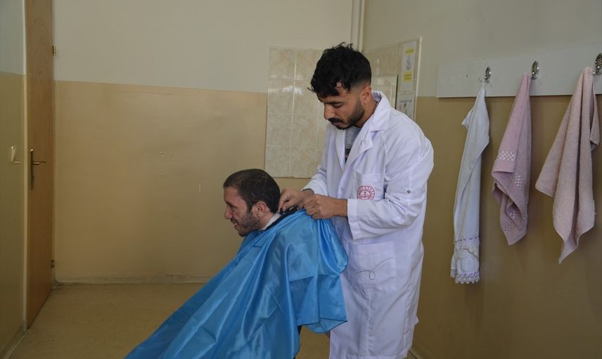 Muş'ta, Ali Kuşçu Özel Eğitim Uygulama Okulu'nda öğrenim gören özel gereksinimli öğrencilerin bayram tıraşını öğretmen Sergen Yaşlı yaptı.
