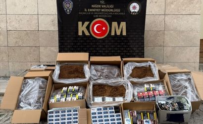 Niğde'de kaçakçılık operasyonunda 3 zanlı gözaltına alındı. Şüphelilerin ikamet, iş yerleri ve araçlarında yapılan aramalarda, 131 bin 500 dolu makaron, 1650 paket sigara, 230 kilogram tütün, 33 kutu sigara paketleme poşeti, 29 paket nargile tütünü, 23 kutu sigara sarma kağıdı, 21 elektronik sigara, sigara basma makinası ve ruhsatsız av tüfeği ele geçirildi.