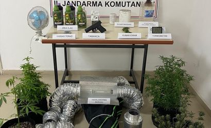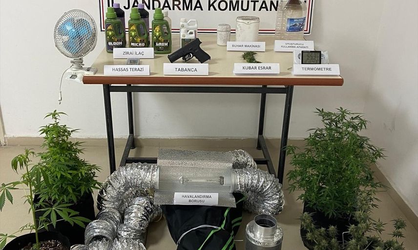Gerçekleştirilen aramada, H.K. (31) adlı zanlıya ait evde iklimlendirme düzeneğiyle yetiştirilen Hint kenevirleri tespit edildi. Ekipler, evde ayrıca 13 gram esrar, 4 kök Hint keneviri, ruhsatsız bir tabanca, uyuşturucu kullanma aparatı, hassas terazi, 18 tabanca fişeği ve 6 litre sıvı gübre buldu.