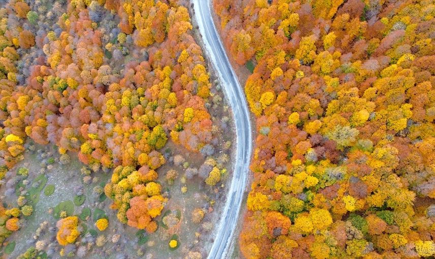Sonbaharın muhteşem renklerini dronla görüntüleyen ekip, doğaseverler ve fotoğraf meraklıları için büyüleyici kareler ortaya çıkardı. Ağaçların oluşturduğu manzara, bu bölgeye olan ilgiyi artırıyor.